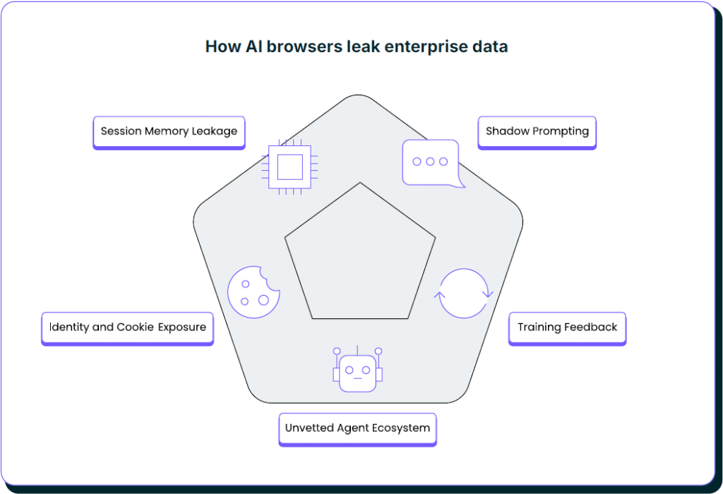Ker AI brskalniki delujejo izven okvirov podjetniške politike, obidejo tradicionalne mehanizme DLP, SSE in EDR – ustvarjajo datotečno nevidne poti za odtekanje podatkov.